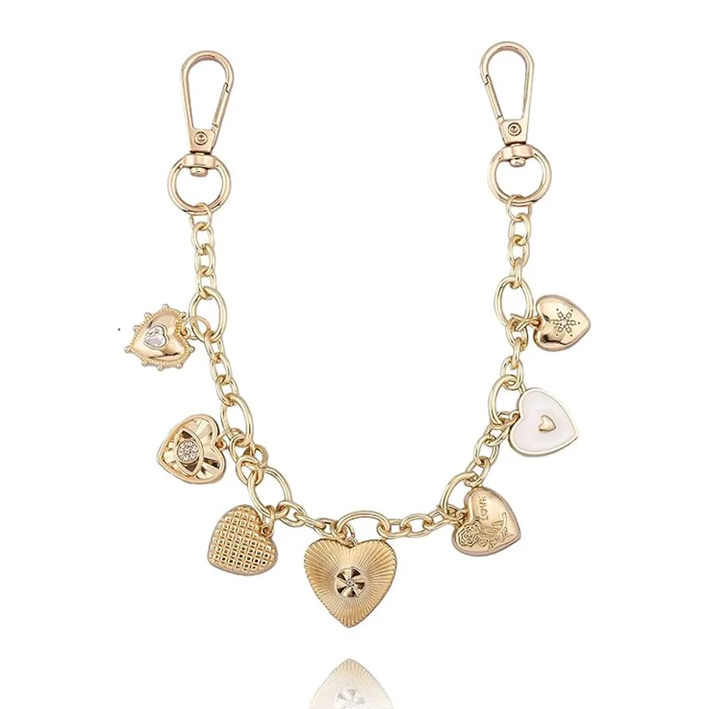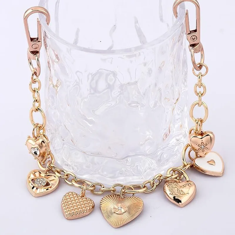 YD JEWEL is de fabrikant en leverancier van handtasbedel van zinklegering in China. Het bevat 1 ketting en 7 unieke hartvormige hangers, ongeveer 30 cm lang. Het heeft een metaalachtige textuur, maar is licht van gewicht en verplettert geen zakken. Het kan worden gebruikt om tassen, sleutels en mobiele telefoons aan op te hangen. Het is modieus en schattig en kan worden gebruikt voor dagelijkse decoratie of als festivalcadeau.
